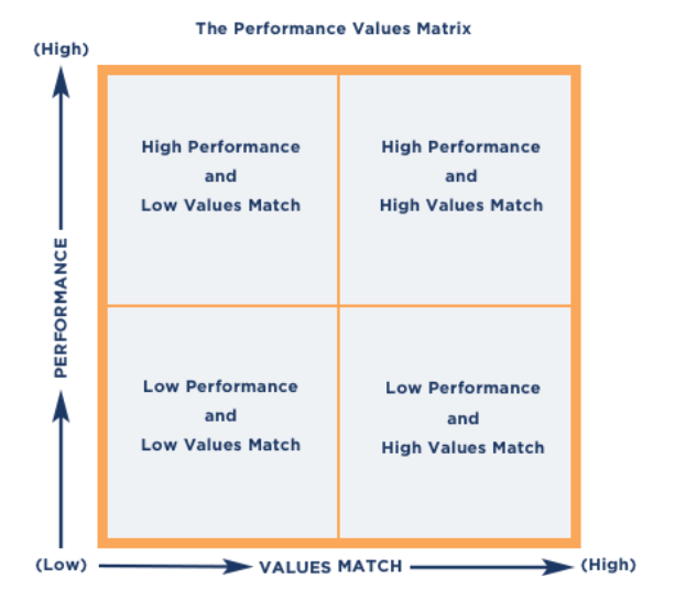 The “Performance-Values Matrix” shows an employee and their manager where the employee is positioned on achieving the performance expectations and the core value expectations of the organization.